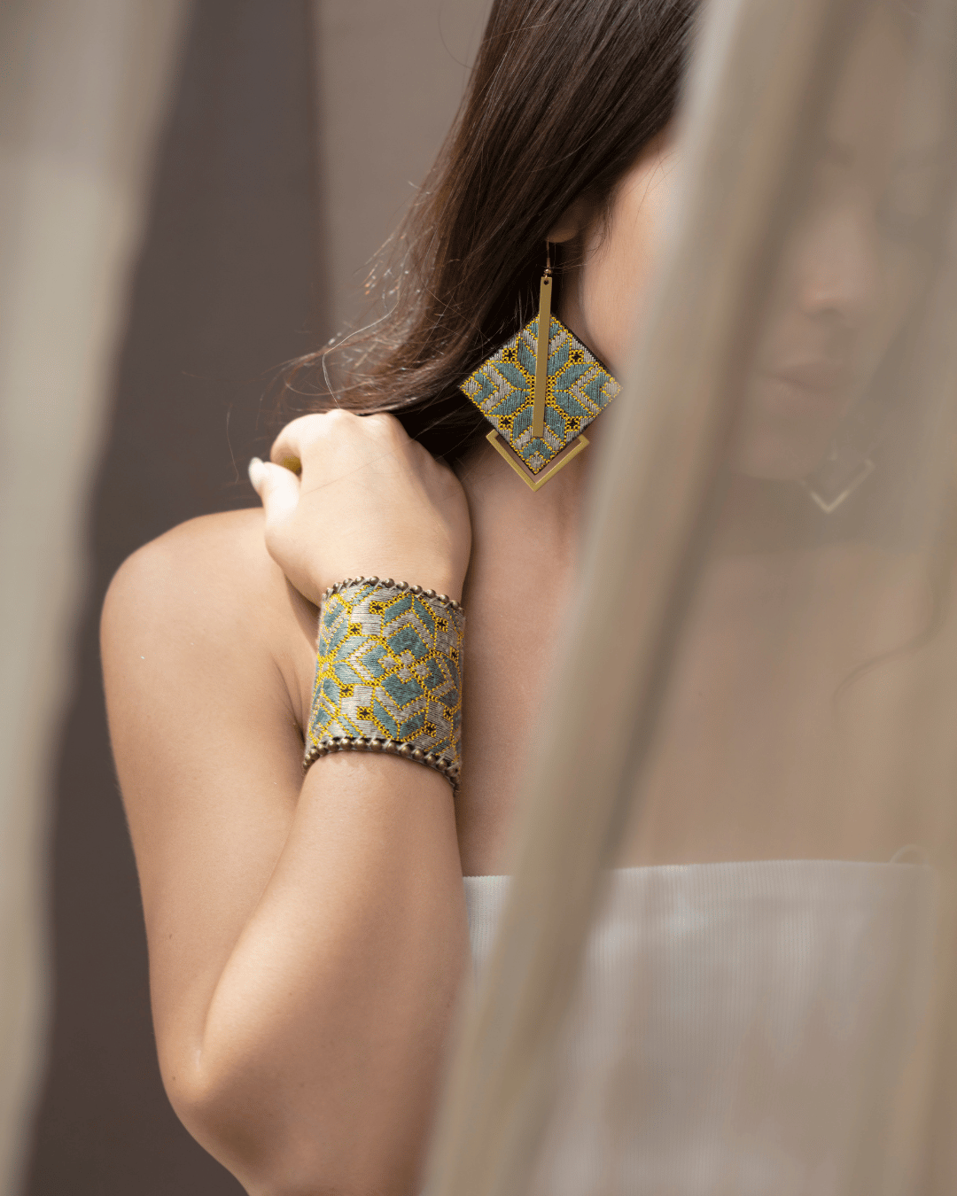 This striking, Graceful and timeless Handcrafted Cuff, features Geometric shapes embroidery, in elegant tones of Green and light Yellow, exudes sophistication and understated charm.